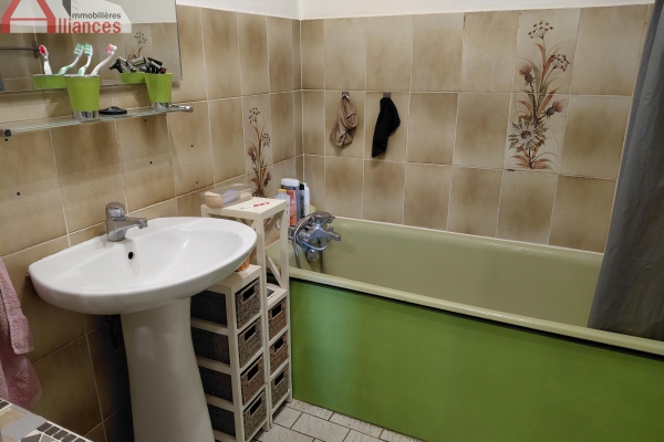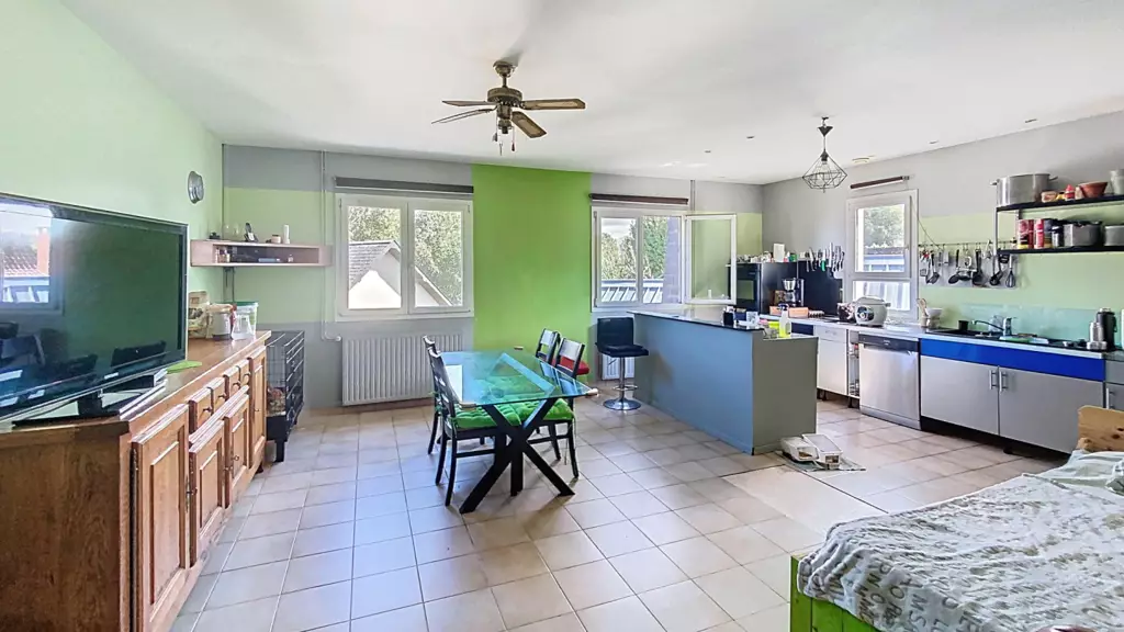 Un grand séjour lumineux avec cuisine ouverte équipée, trois chambres, un bureau, un WC séparé, une salle de bain.