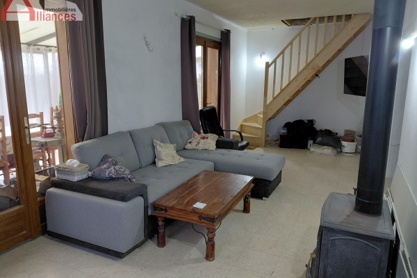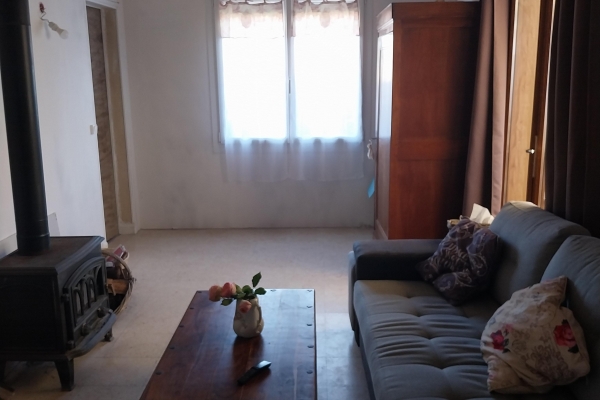 Un séjour lumineux avec poêle à bois, une cuisine équipée, une chambre, une salle d'eau avec douche, vasque et WC, une grande véranda.